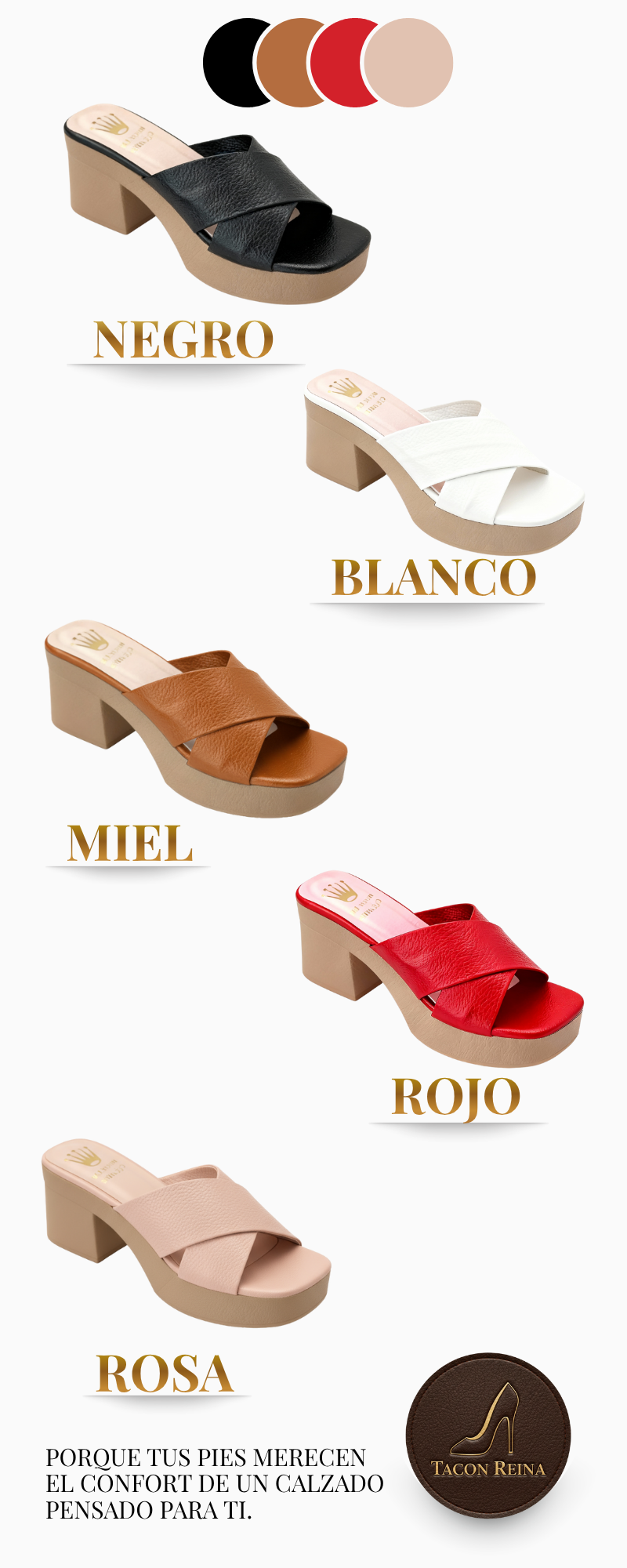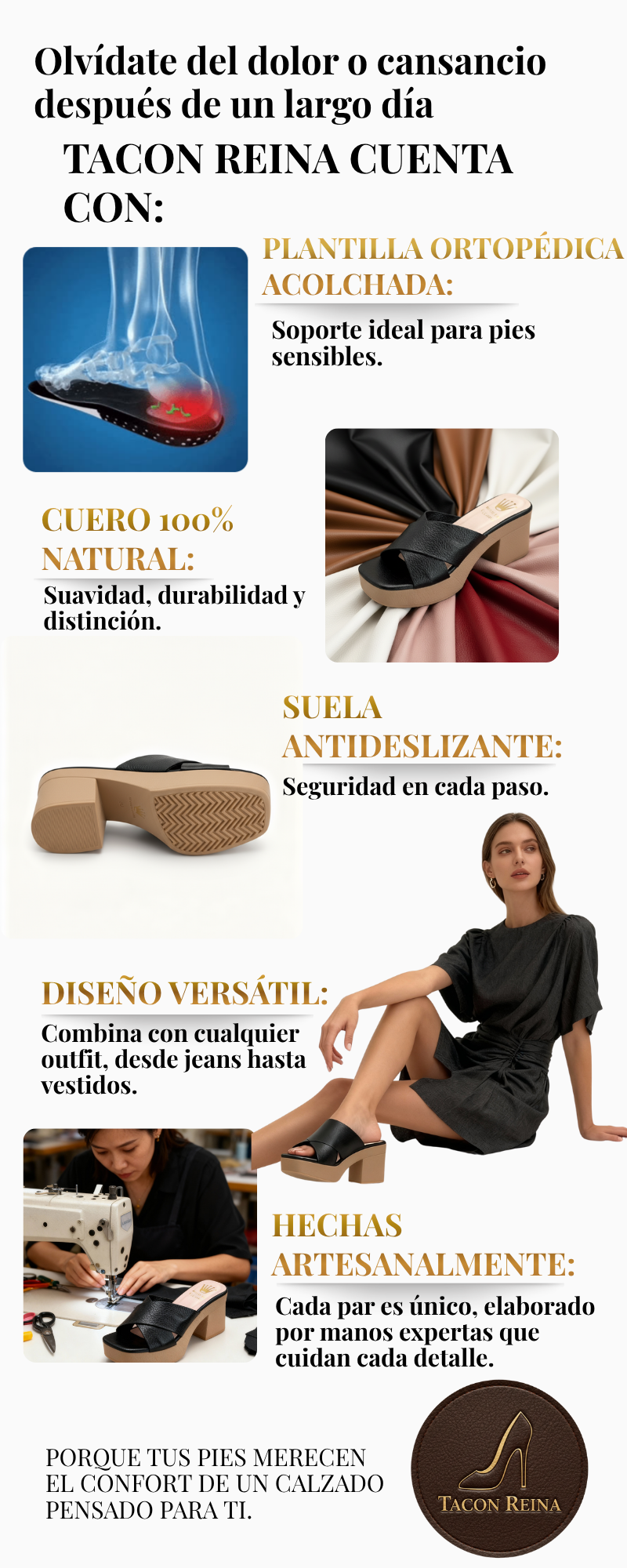 El Tacón Reina están hechas en 100% cuero auténtico, con plantilla ortopédica y suela antideslizante que cuida cada paso. Perfectas para combinar con cualquier outfit y lucir elegante todos los días.